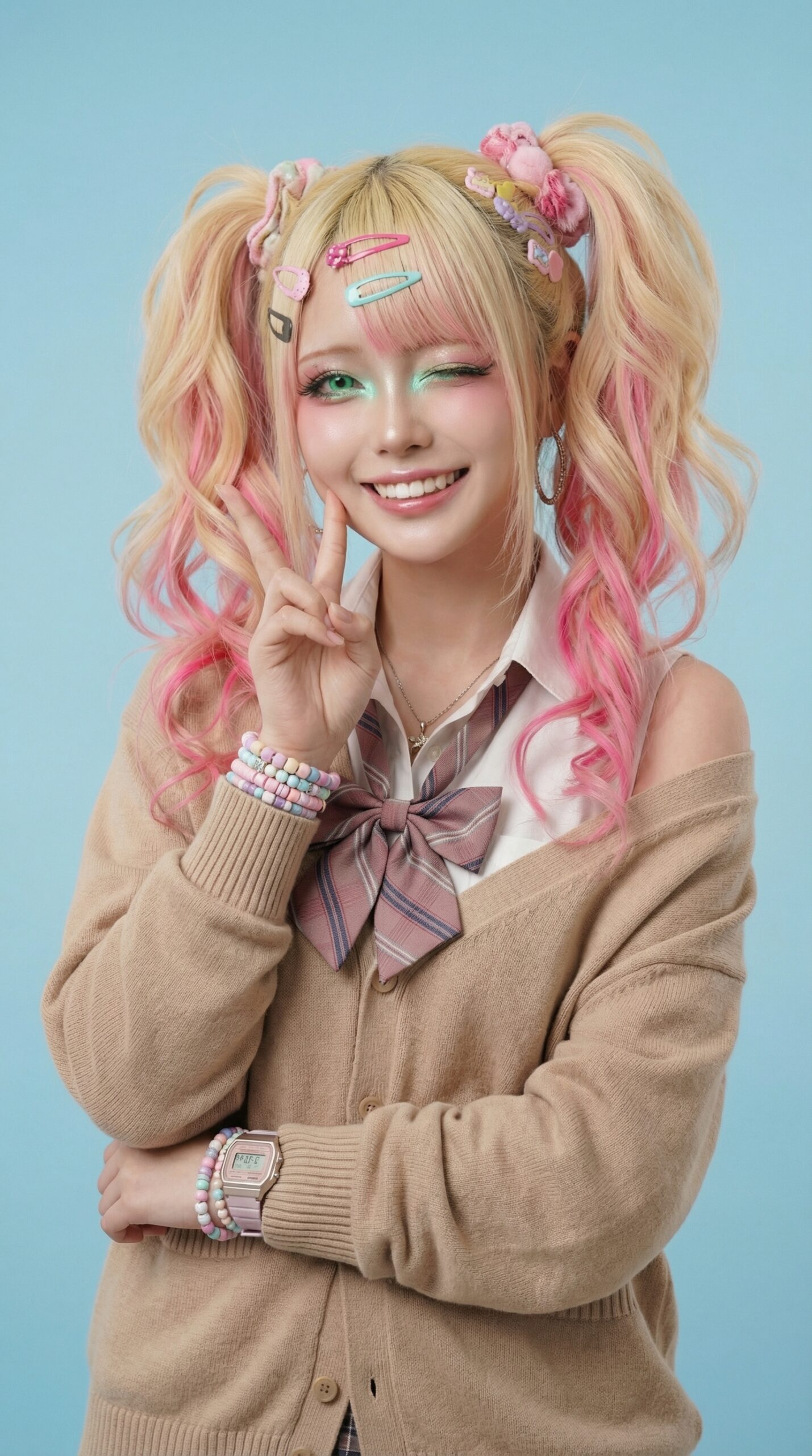 見た目はどこにでもいる令和のギャルJK。でも、その正体は座敷童——何百年も前からこの世にいる妖怪そのもの。人間のフリをして東京の高校に通い、ギャルメイクを完璧にキメて、スマホ片手に全国の妖怪スポットを巡る。妖怪が見えるのは当たり前、だって自分が妖怪だから。ティールグリーンの瞳は人間には存在しない色——座敷童としての本質が、目の色だけに滲み出ている。見えないけど、そこにいる。WRASHI自身がそうであるように。